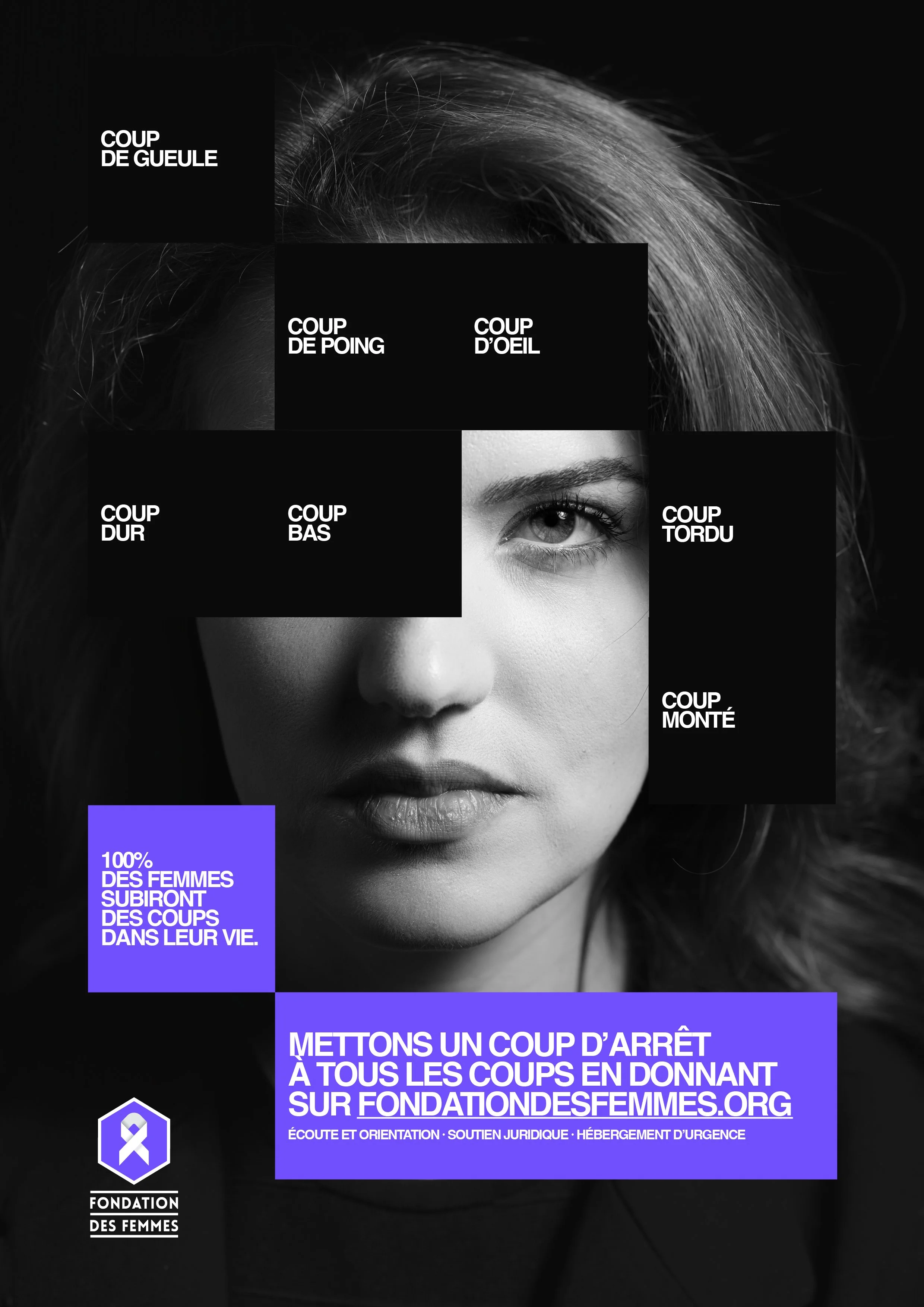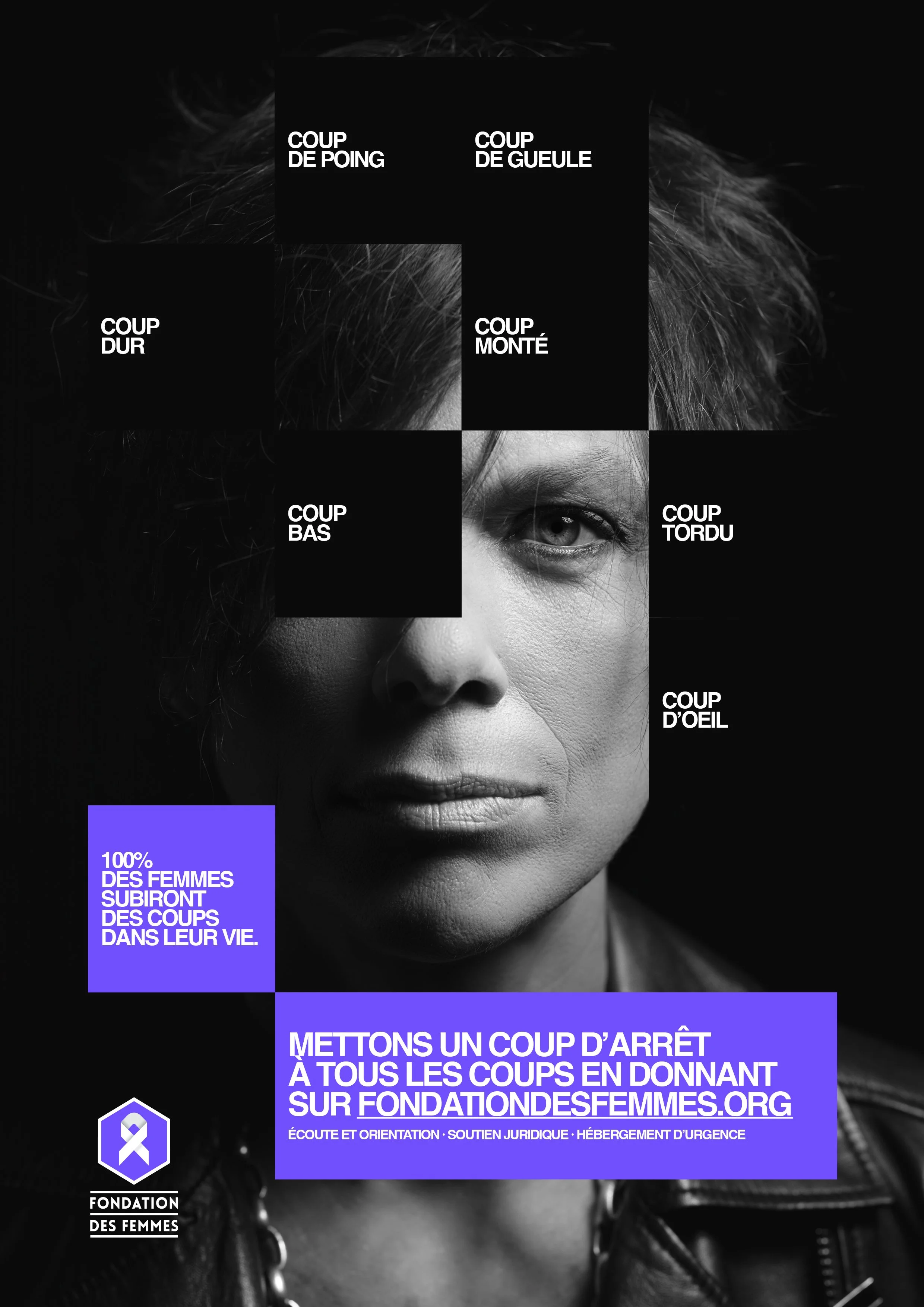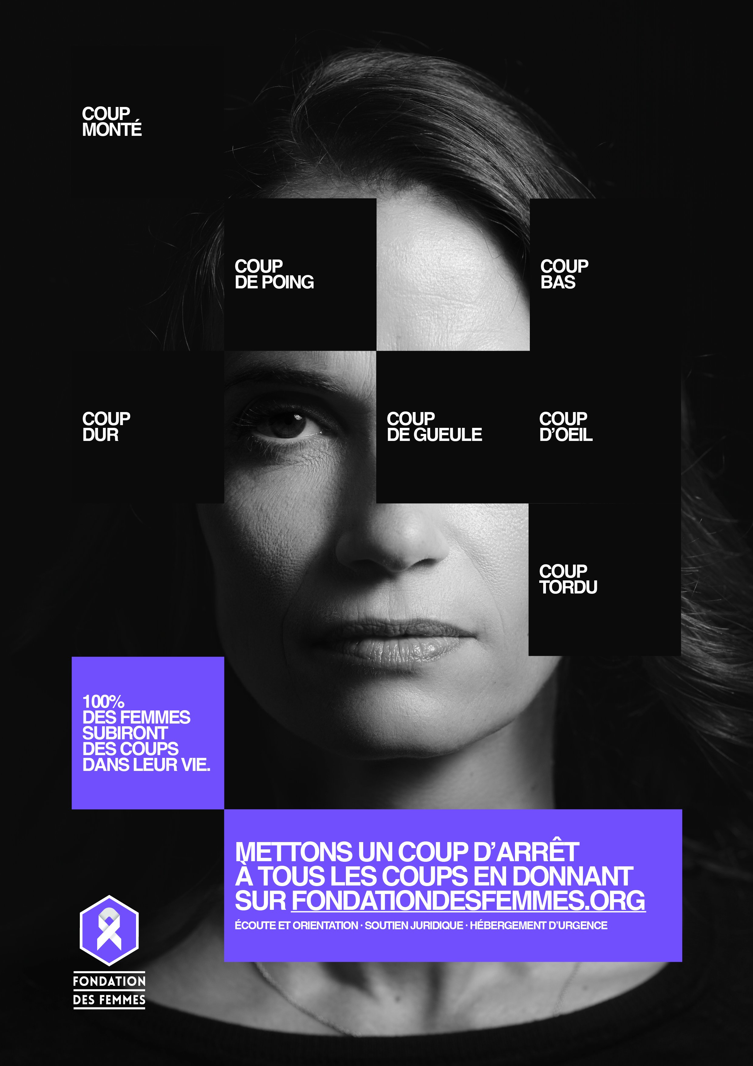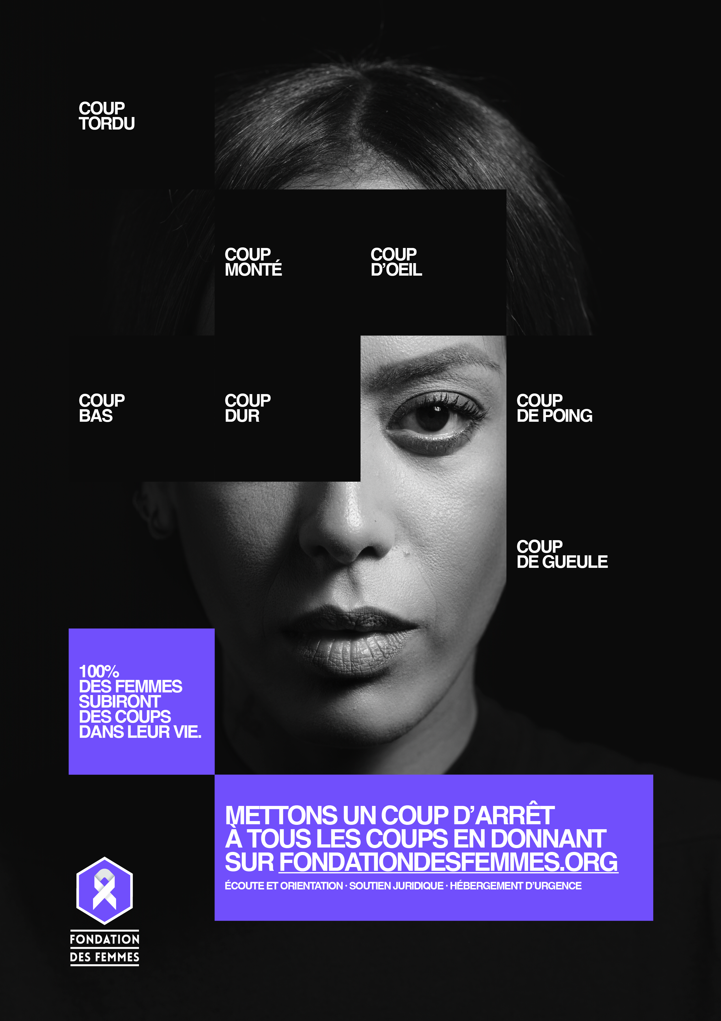 Coup de gueule, coup de poing, coup d’œil, coup tordu ou coup bas, 100 % des femmes ont subi, subissent ou subiront des violences au cours de leur vie. C’est le constat alarmant à l’origine de cette camapgne pour la Fondation des Femmes à l’occasion du 25 novembre, journée internationale pour l’élimination des violences à l’égard des femmes.