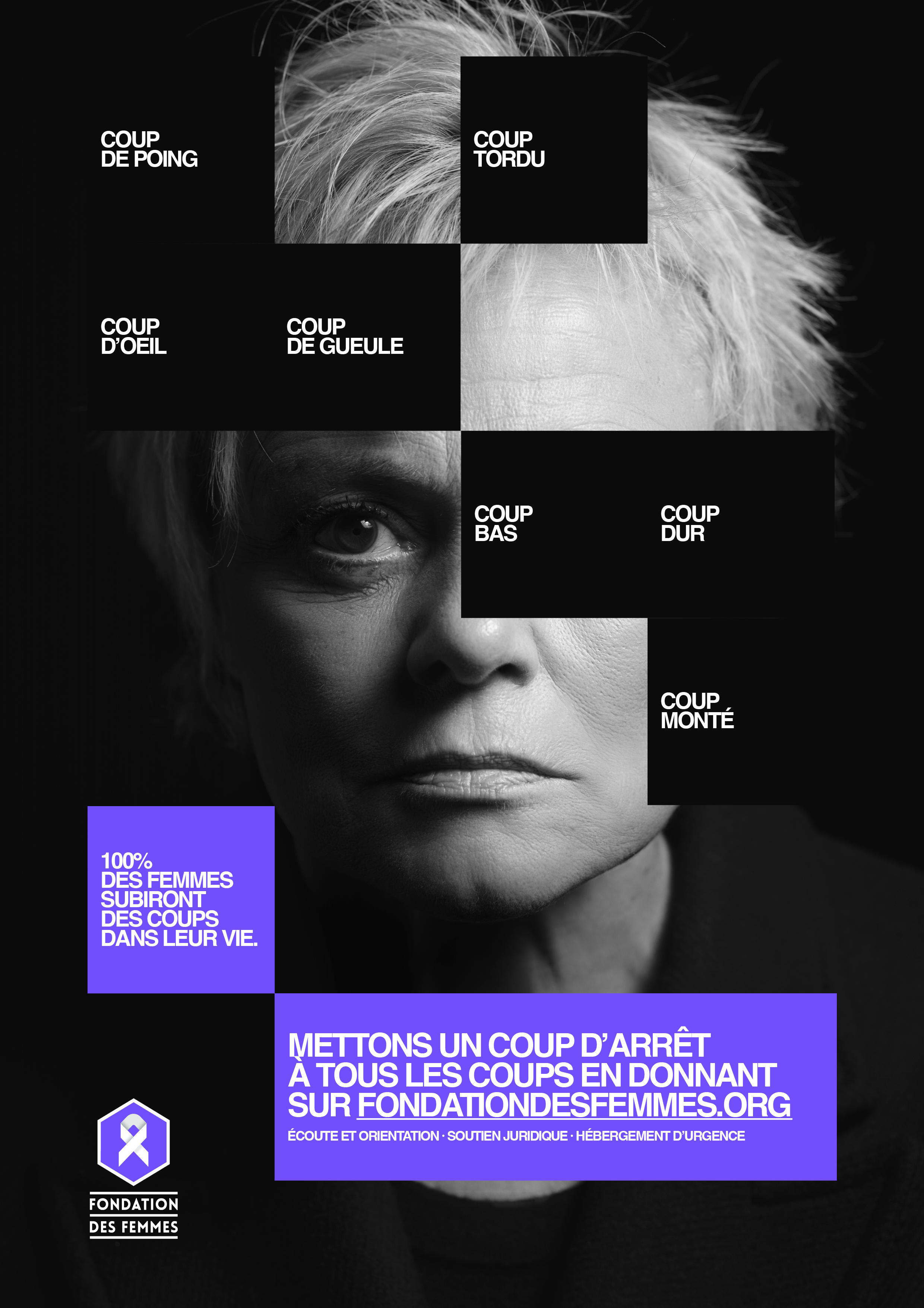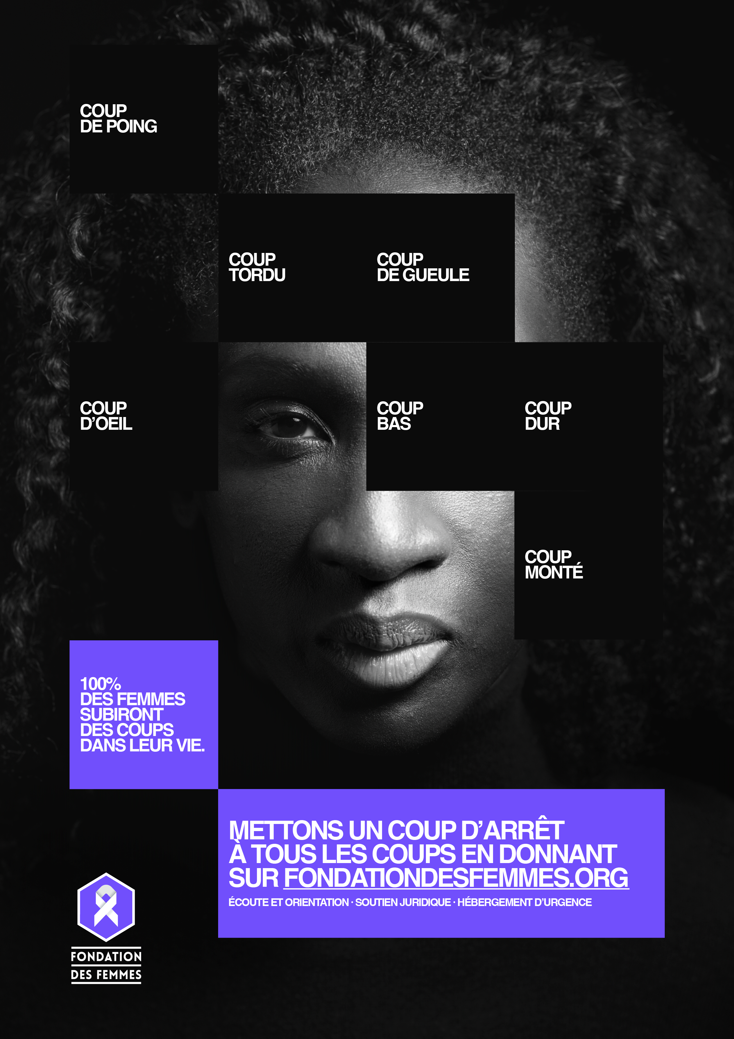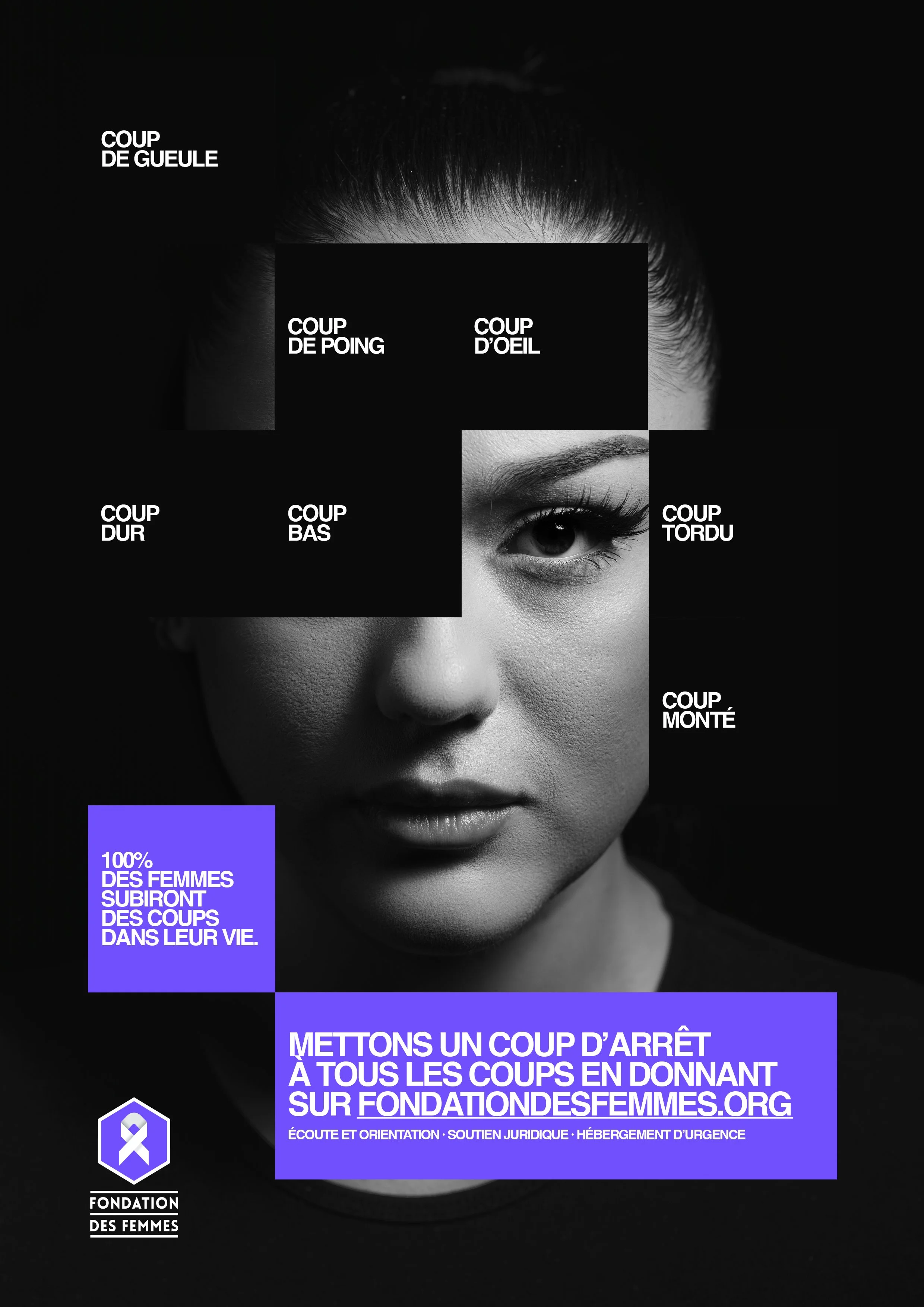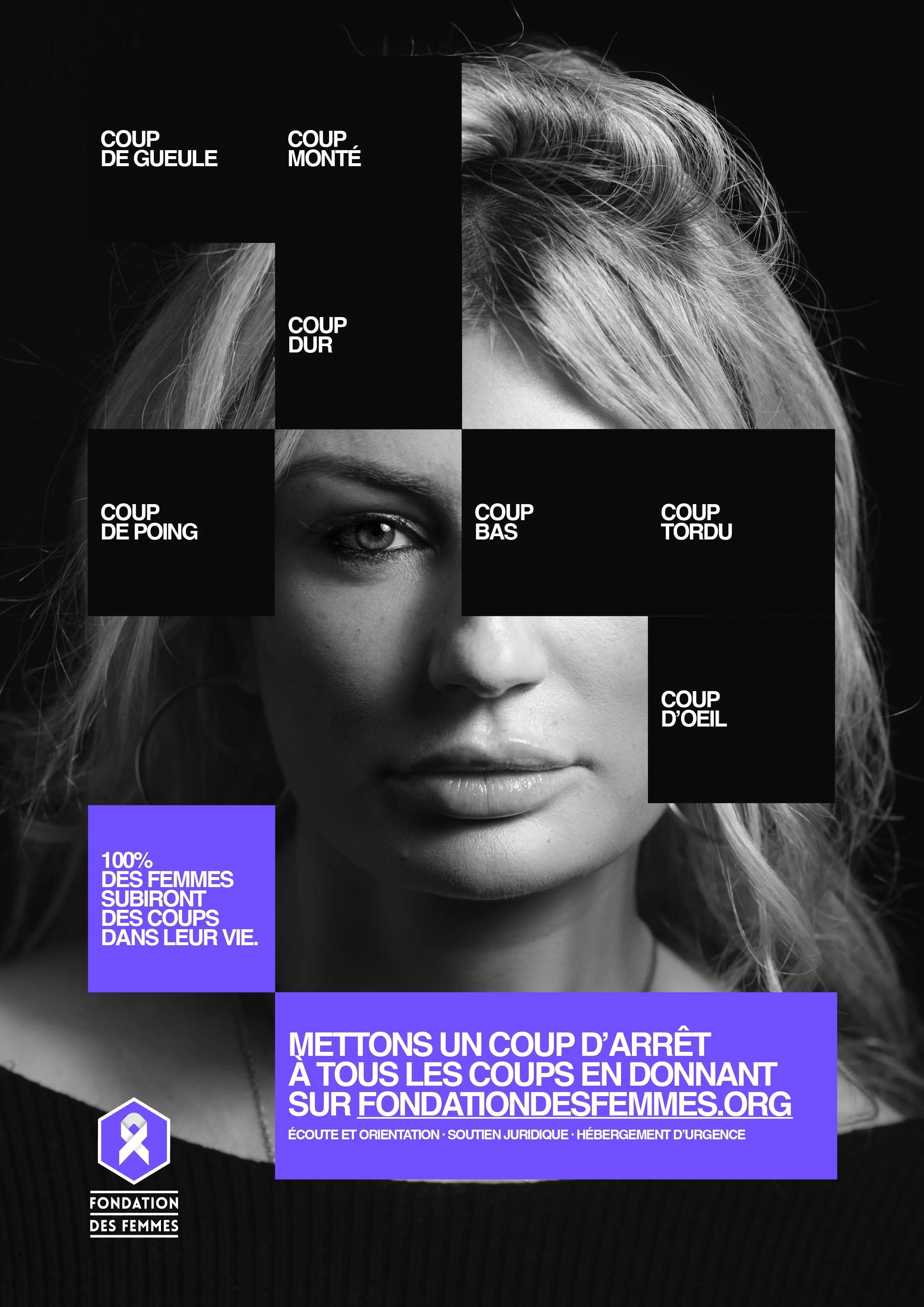 Coup de gueule, coup de poing, coup d’œil, coup tordu ou coup bas, 100 % des femmes ont subi, subissent ou subiront des violences au cours de leur vie. C’est le constat alarmant à l’origine de cette camapgne pour la Fondation des Femmes à l’occasion du 25 novembre, journée internationale pour l’élimination des violences à l’égard des femmes.