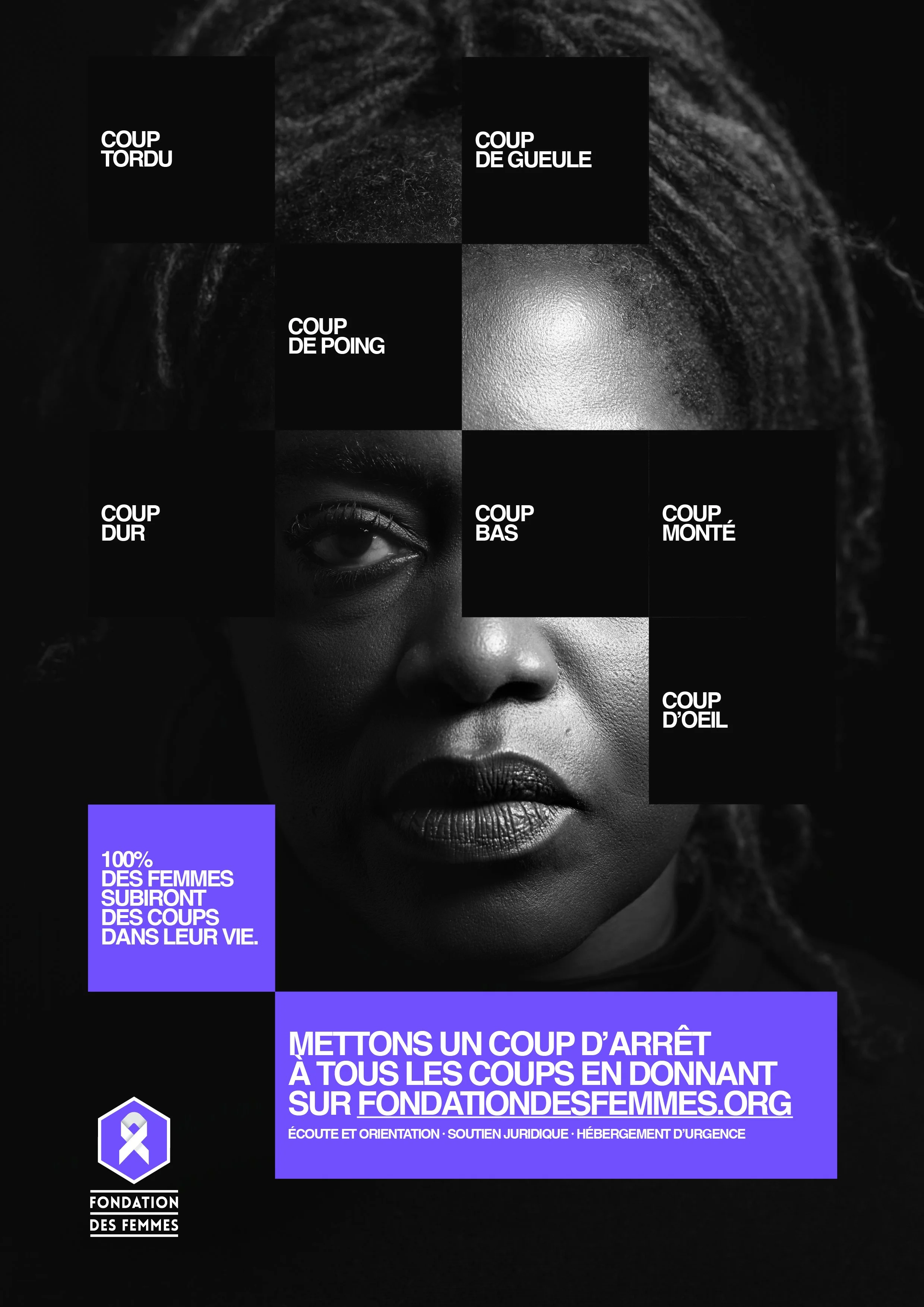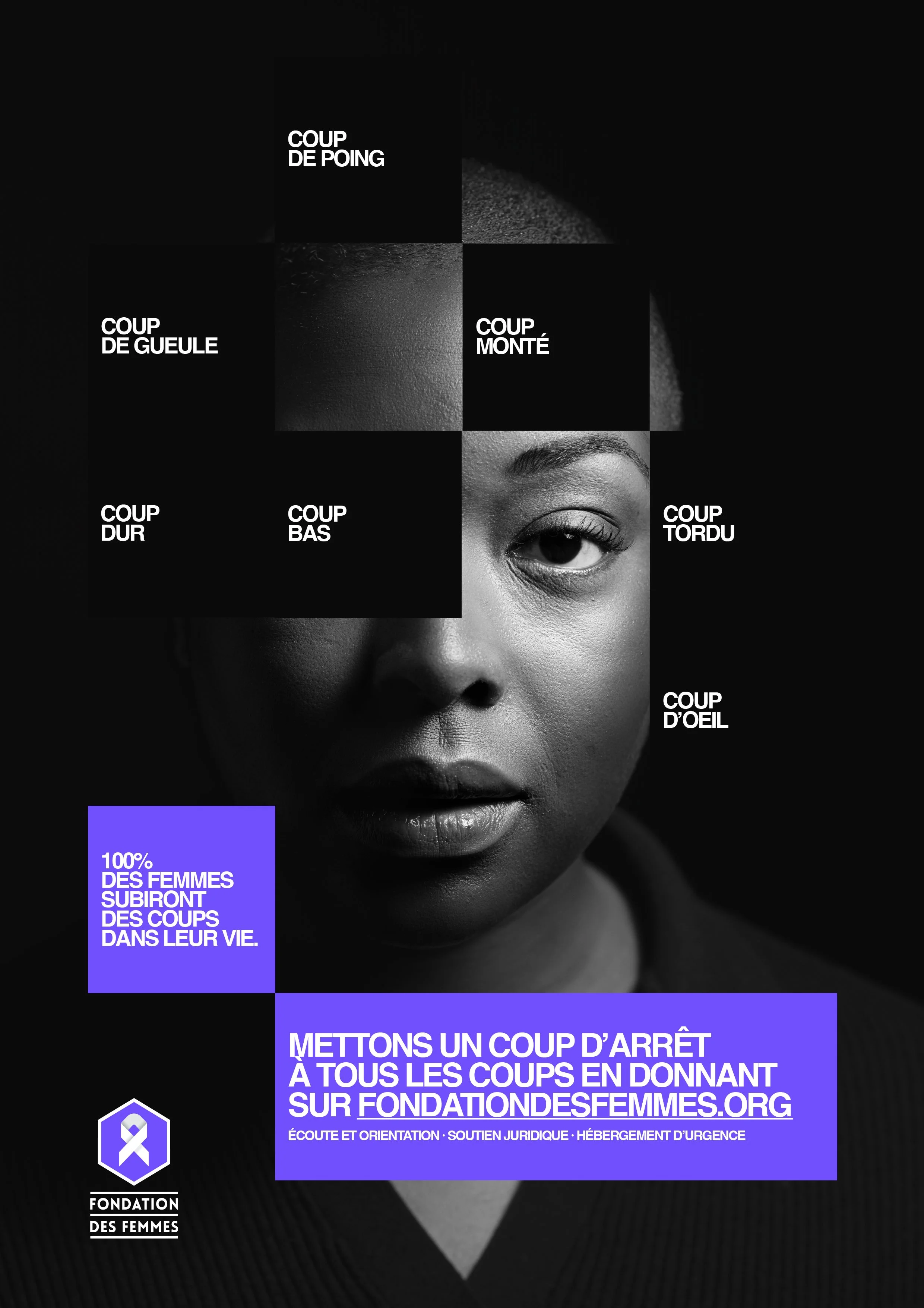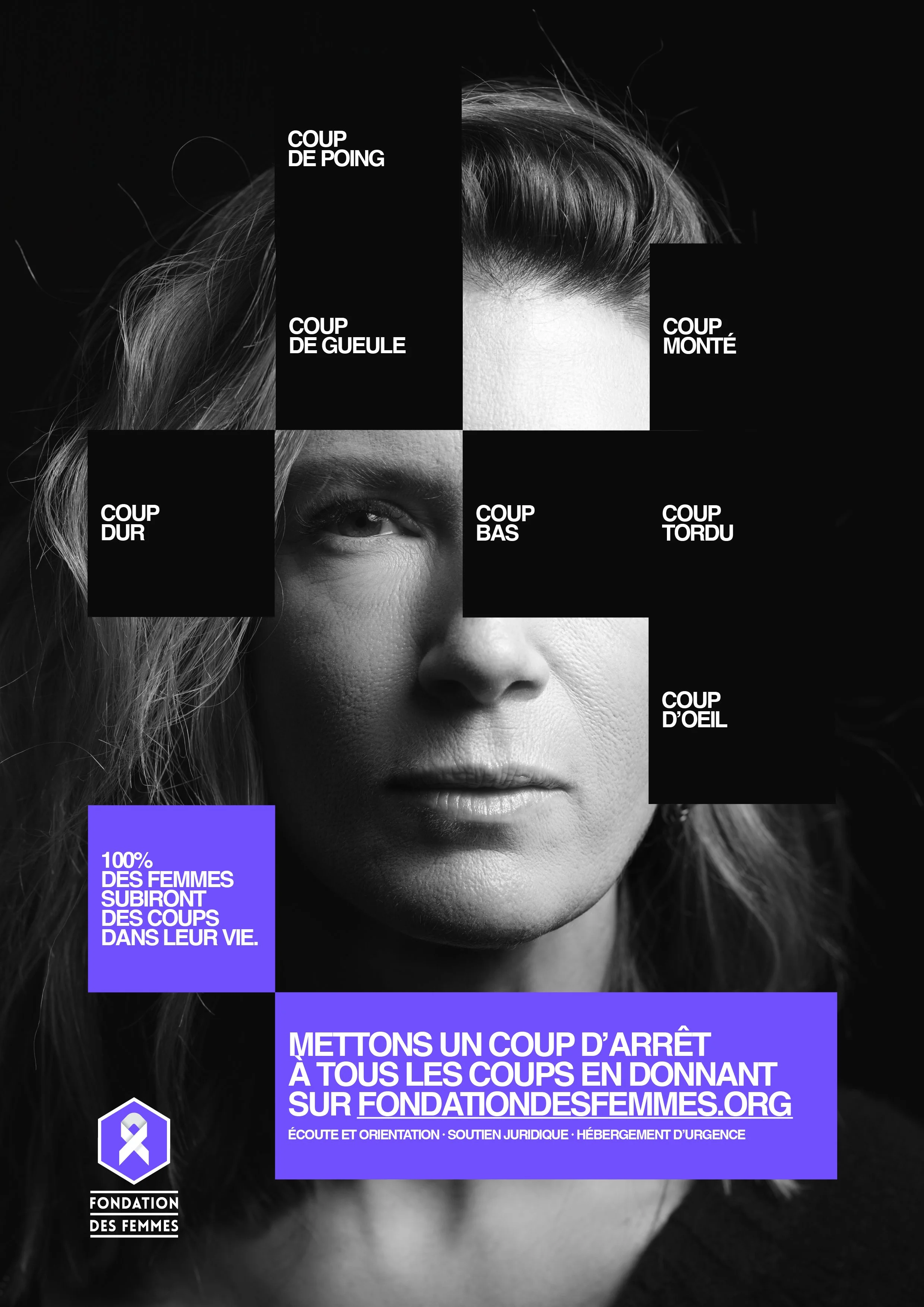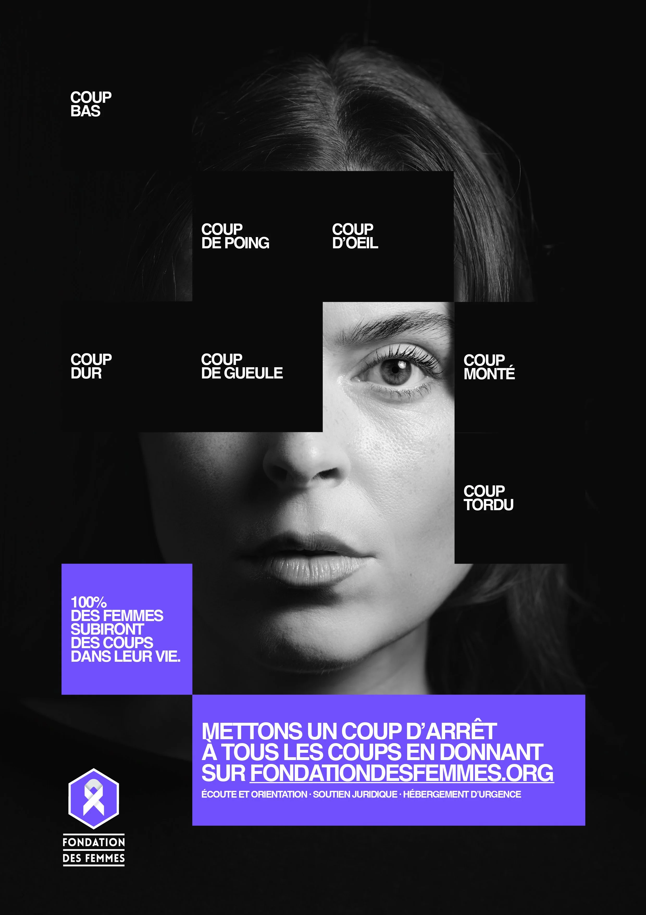 Coup de gueule, coup de poing, coup d’œil, coup tordu ou coup bas, 100 % des femmes ont subi, subissent ou subiront des violences au cours de leur vie. C’est le constat alarmant à l’origine de cette camapgne pour la Fondation des Femmes à l’occasion du 25 novembre, journée internationale pour l’élimination des violences à l’égard des femmes.