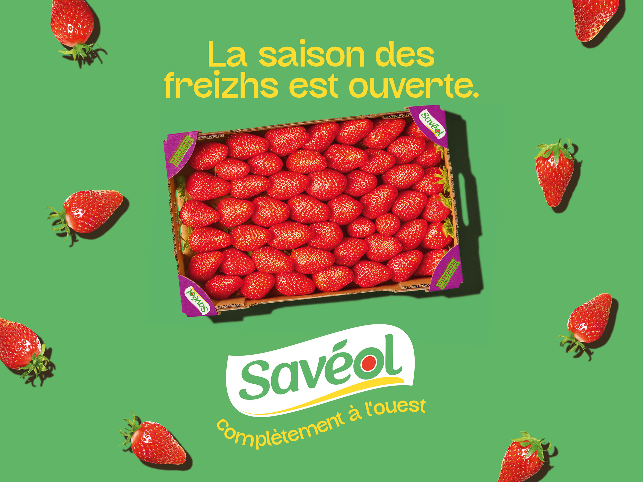 Pour annoncer l’ouverture de la saison des freizhs bretonnes, Savéol continue d’afficher les plus grands clichés bretons. Cette fois-ci, c’est la météo (parfois) capricieuse en Bretagne qui est à l’honneur. Quelques indices sont dissimulés dans nos fraises en gros plan. De loin, on y voit de la pluie.